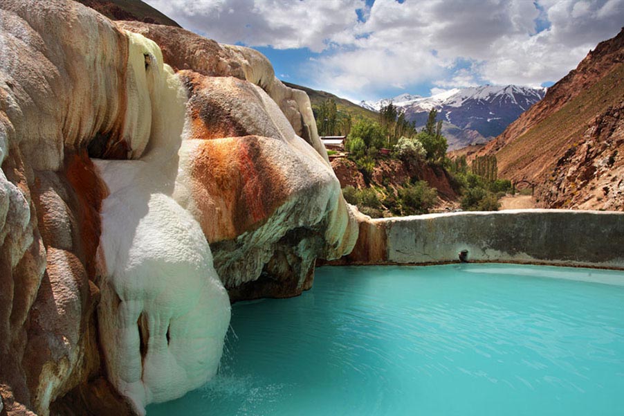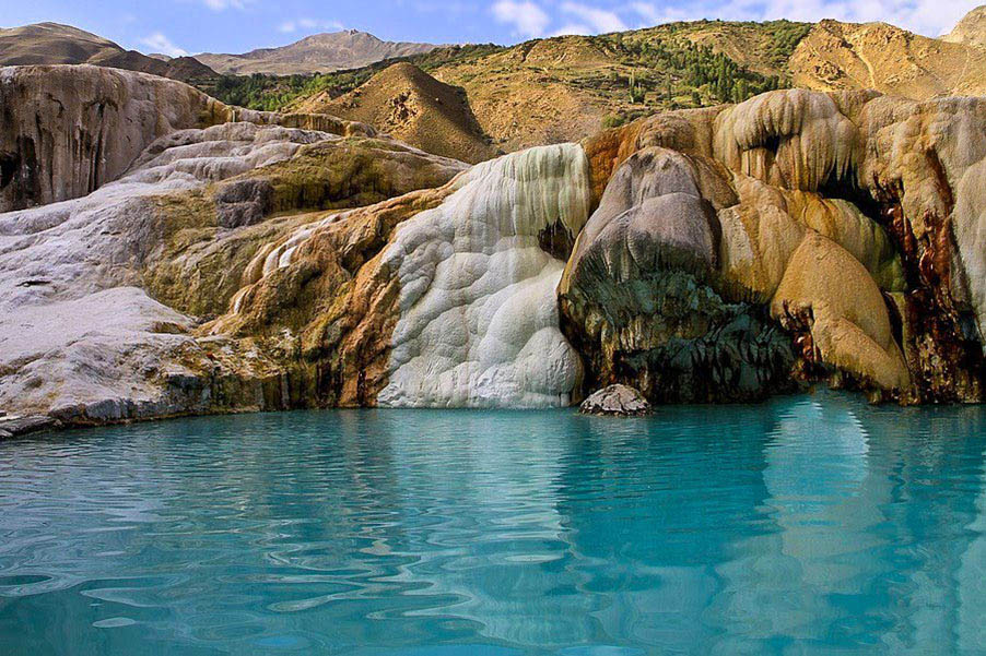 Отложения таких шариков и известняка образуют натёки – травертиновую горку, в конце которой есть ряд естественных чаш – бассейнов различного размера, с водяным зеркалом от 0,5 до 20 кв. м и глубиной до полуметра. Они наполнены горячей водой бирюзового цвета, в состав которой входят железо, алюминий, магний, стронций, фтор и другие элементы. В воде содержится также большое количество сероводорода, кремневой кислоты и углекислоты.